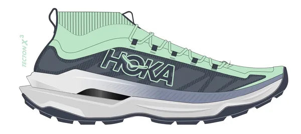 Carbon-plated propulsion for the trail.Ready to propel you through gnarly terrain the Tecton X 3 adds winglets to its carbon fiber plates for extra stability in just the right spots and two layers of PEBA in the midsole—our lightest most resilient compound. Redesigned lug shape and positioning on a Vibram® Megagrip with Litebase outsole provide better traction while a dynamic vamp allows feet to splay as the miles fly by. Topping it off a knit collar extends up from the tongue like a gaiter to mitigate trail debris and a lightweight Matryx® textile upper makes this version more durable and trail-worthy than ever.Best for: Trail Running RaceFeatures: Gaiter-like extended knit collar Matryx® textile upper Ghillie lace construction Dynamic vamp for foot splay Dual-layer PEBA midsole Patent-pending parallel carbon fiber plates with winglets for stability Speed-centric MetaRocker™ Vibram® Megagrip Litebase outsole with Traction Lug 4mm lugs